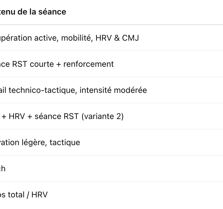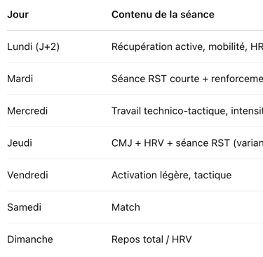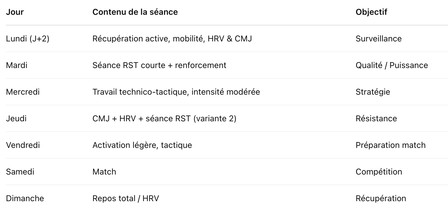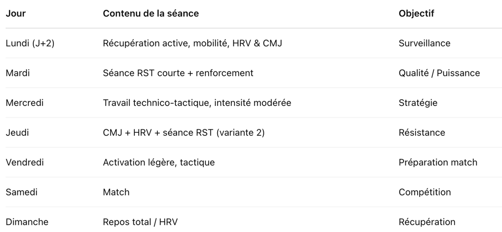 La littérature scientifique, notamment les travaux de Buchheit et Laursen (2013), suggère que deux séances de RST par semaine suffisent pour induire des adaptations notables. L’enjeu réside donc dans le timing : en général, les journées J+2 ou J+3 après un match sont idéales, car elles laissent le temps au système neuromusculaire de récupérer partiellement tout en maintenant un certain niveau de charge. On peut également envisager une séance RST dès J+1 lorsque le match a été peu exigeant, pour relancer le système anaérobie en début de microcycle.